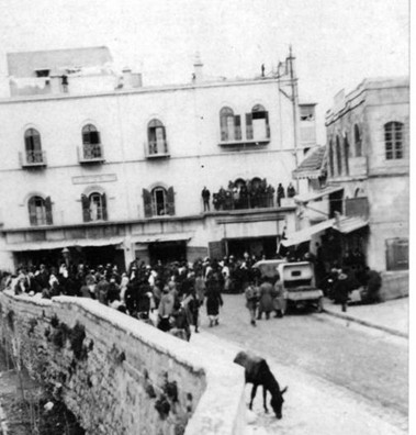 חנות היין של משפחת ג’יניאו בקומת המסד של מלון אמדורסקי (החנות הימנית, שמעליה עומדים אנשים במרפסת). אוסף גבריאל ג’יניאו, אתר ישראל נגלית לעין, יד יצחק בן צבי www.israelalbum.org.il.