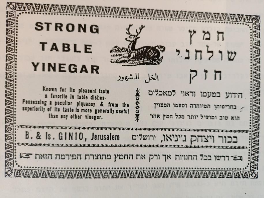 פרסומת לחומץ של ג’יניאו (מתוך: ר’ ולירו, ירושלים של מטעמים, תל אביב תשמ”ד, עמ’ 38).