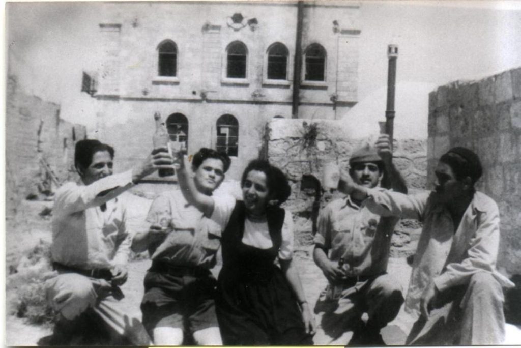 לוחמי תש”ח בעיר העתיקה חוגגים עם יין ג’יניאו. מרתף היקב שימש באותם ימים מחסה מפני ההפגזות. הלוחמים בתמונה (משמאל לימין): אפרים לוי, חיים וינבך, מזל שוישא שרירא, שמעון לוי, מזרחי בובו (גבריאל) (ראו: ג’יניאו הנ”ל, אבן מאבני ירושלים, עמ’ 54-53). באדיבות מוזאון חצר היישוב הישן.