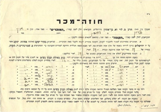 עיון בחוזה מוביל אותנו למסקנות הבאות: שני יהודים – מ. לוי וא. בן אהרן – הם שמכרו חלקת אדמה לאייזיק פלדמן, יהודי מוודביין (Woodbine), ניו ג’רסי, ארה”ב. מלבד תנאי המכירה וסידורים פרוצדורליים, התחייב הקונה להשתתף עם בעלי המגרשים האחרים בהקמת חברה לפיתוח, שתפעל להכשיר את השטח “לשם סלילת כבישים, סדור מפעל המים, בנינים צבוריים ושרותים צבוריים שונים […] ולגנים צבוריים, בהתאם למפה שתאושר ע”י הממשלה”. דהיינו, השטח יועד להקמת התיישבות. לחוזה נספח “שטר הַשְׁלָשָׁה” – התחייבות הקונה להעברת תשלומים בפני בנק גאולה ובניין בירושלים. המסמך נושא תאריך – 6 בפברואר 1935. אם כן, אכן מדובר בתקופת המנדט: