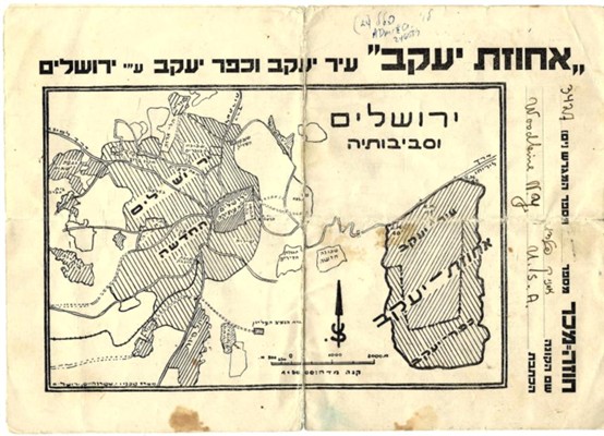 המפה אינה נושאת תאריך, אבל במבט ראשון – על פי ממדי ירושלים ושמות השכונות שמצוינות עליה, שיערתי כי שורטטה בתקופת המנדט. הנתון המרשים ביותר הוא העובדה ששטחי ה’אחוזה’ נראים במפה כאילו ‘מתחרים’ בהיקפם עם שטחי העיר עצמה. במפה מצוין שאחוזת יעקב התחלקה לשתי שכונות משנה: “עיר יעקב” הצפונית ו”כפר יעקב” הדרומי. מה מספרת המפה? האם אחוזת יעקב אכן הוקמה, ומה פשר חלוקתה לשניים? מי הקים אותה ומתי, ובכלל מיהו אותו יעקב? מי גר שם ולאן הוא נעלם?