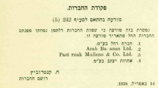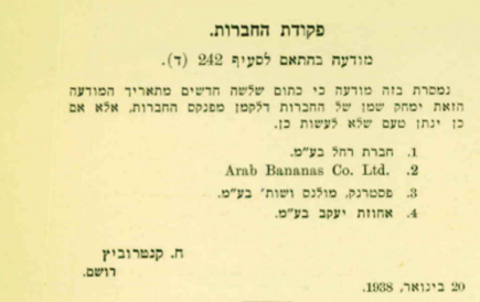 בעקבות פנייתי, צלל חברי המלומד חנוך גוטליב אל עיתוני התקופה ודלה עוד כמה פרטים על פרשיית אחוזת יעקב. בהעתון הרשמי של ממשלת פלשתינה א”י פורסמה ביום 31.7.1936 ידיעה על רישום החברה ב’פנקס החברות’