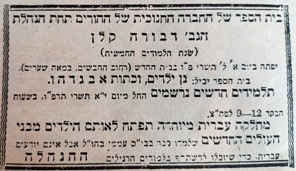 היישוב הישן בירושלים לא הצטיין בפתיחות לרעיונות חינוכיים פרוגרסיביים וליברליים, ודבורה קלן פנתה אל חברת המשכילים הירושלמית, מחוגי שכונות רחביה וזכרון משה. הורים אחדים, כמו משפחות סוקניק (בן המשפחה – יגאל ידין, לימים רמטכ”ל צה”ל, למד כאן), פרוז’ינין, מגנס ומלכין, הוקסמו מרעיונותיה והיא פתחה בשנת 1921 בית ספר פרטי, בתחילה ליד בית החולים האיטלקי שברחוב סנט פול (כיום רחוב שבטי ישראל) ואחר כך לא הרחק משם, ברחוב מליסנדה (כיום רחוב הלני המלכה) (בבניין ששימש לימים את קול ישראל ורשות השידור). למוסד החינוכי שלה היא קראה ‘בית הספר של החברה החינוכית של ההורים’ על שם ג’וליאן ויליאם מאק, משפטן יהודי-אמריקני ופעיל ציוני, שעמד לצדה של דבורה קלן וסייע לה בהקמתו.