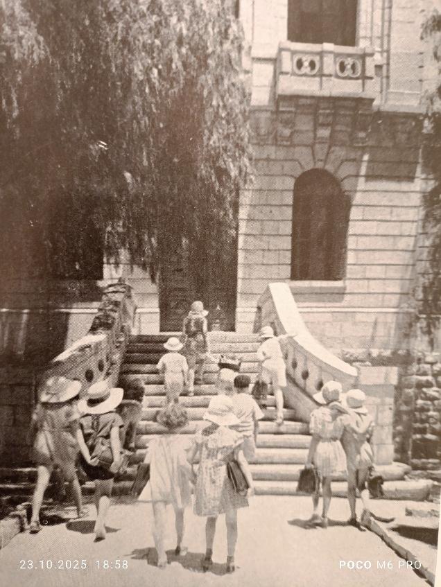 תלמידים ותלמידות בפתח הבניין ברחוב הלני המלכה 23, ששימש את בית הספר של דבורה קלן.