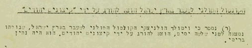 ידיעה שהתפרסמה בעיתון ‘בגלות קניה’, ביום 2.3.1948. עיתון זה היה ביטאונם של לוחמי אצ”ל, שהוגלו על ידי הבריטים לקניה שבאפריקה בשנים 1948-1944. עורך העיתון היה העיתונאי יוסף ויניצקי.