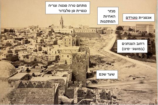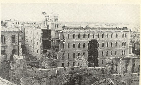 מנזר נוטרדם בתום קרבות מלחמת השחרור – מבט מתוך העיר העתיקה. בקדמת התצלום: חומת העיר העתיקה, ומאחוריה חורבות מנזר האחיות המתקנת.