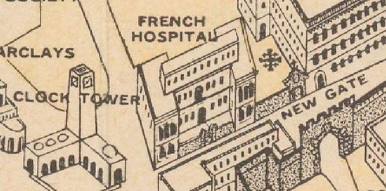 איור של השער החדש ((New Gate במפת ספירידון, משנת 1930. משמאלו – מנזר האחיות המתקנות (צמוד לחומה) ובית החולים סן לואי (French Hospital). מימינו – פינת בניין אכסניית נוטר דם דה-פראנס. ביניהם צויר צלב גדול המוקף בארבעה צלבים קטנים – זהו ‘צלב ירושלים’, מוטיב נוצרי נפוץ. משמאל – מגדל השעון מעל בית הדואר המנדטורי בכיכר אלנבי, הלא היא כיכר צה”ל של ימינו | הספרייה הלאומית, אוסף המפות ע”ש ערן לאור.
