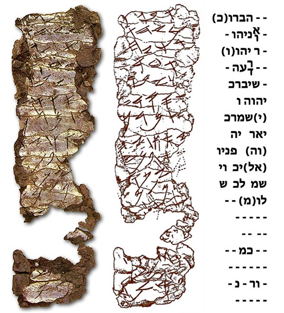 לוחית כסף זעירה מתקופת הבית הראשון שנמצאה בחפירה ארכאולוגית בכתף הינום בירושלים, ועליה חרוטים פסוקי ברכת הכוהנים (עיבוד: תמר הירדני).