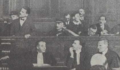 שלום שוורצברד בבית המשפט (עומד). מתחתיו, עורך דינו אנרי טורז. פריז, אוקטובר 1927 (מקור: Krasnay Niva, 13.11.1927).